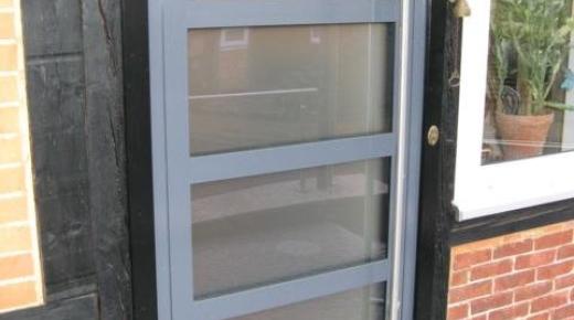 Haustür in grau-blau mit vier Milchglas-Lichtausschnitten in Kassel